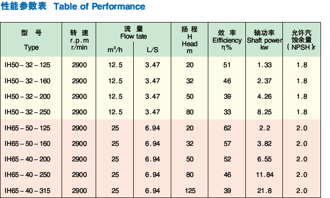 本系列泵性能范圍流量6.3~400m3/h揚(yáng)程5~200m,輸送介質(zhì)一般為-20℃~105℃,根據(jù)所輸送介質(zhì)泵的腐蝕情況,用戶可選用相應(yīng)的耐腐蝕材料。